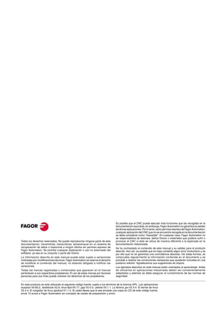 Este documento presenta un ejemplo de programación para el contorneado de una geometría cualquiera que consta de las siguientes partes: encabezamiento, entrada al contorno, geometría, salida tangencial, repetición de bajadas y finalización. Explica conceptos como coordenadas absolutas e incrementales, penetración de la herramienta mediante repetición, compensación de radio y entradas/salidas tangenciales.