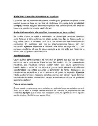 Este documento define varias falacias lógicas y de razonamiento. Identifica falacias formales e informales, incluyendo falacias de atinencia como el argumento por ignorancia, el argumento contra el hombre, la apelación a la fuerza, el argumento a la piedad, la apelación a la emoción y la apelación inapropiada a la autoridad. También describe el accidente inverso y la falacia por accidente.