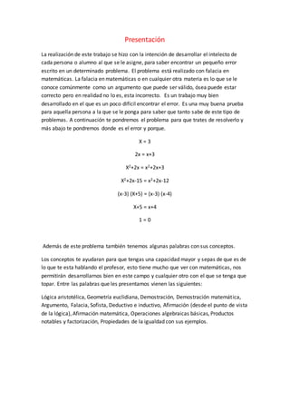 Este documento presenta un problema matemático con una falacia para que los estudiantes practiquen encontrar errores. Explica los pasos del problema de manera detallada y luego revela que el error está en la factorización, donde un lado da como resultado 8 y el otro 7. También incluye definiciones de varios términos matemáticos como lógica aristotélica, geometría euclidiana y demostración.