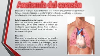El documento describe la anatomía y función del corazón. El corazón es un órgano hueco en forma de cono compuesto principalmente por músculo cardiaco. Se encuentra en el tórax detrás de la pared torácica. Está formado por tres capas y contiene válvulas que regulan el flujo sanguíneo.