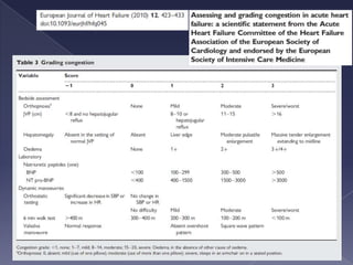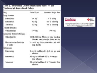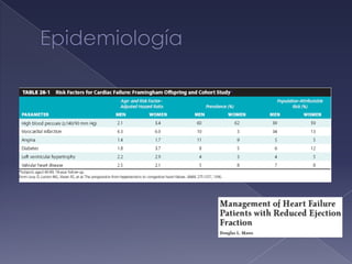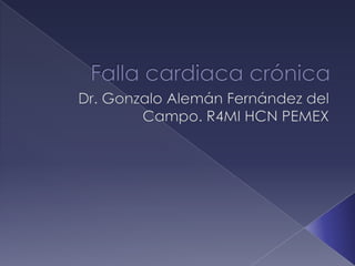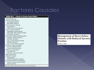 El documento resume la falla cardiaca, afectando a millones de personas en los EE.UU. cada año. Describe la falla cardiaca como un síndrome que limita la capacidad del corazón para bombear sangre de manera efectiva. Detalla las principales guías para el diagnóstico y tratamiento de la falla cardiaca, incluyendo el uso de diuréticos, IECA, antagonistas de angiotensina II y betabloqueadores para mejorar los síntomas y prolongar la supervivencia. Resalta la importancia de evaluar la fracción de eyección, caus