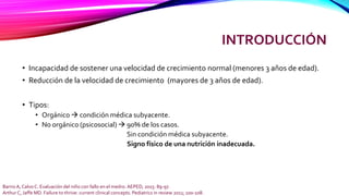 Este documento describe la falla en el crecimiento o fallo para prosperar. Define la condición como una incapacidad para mantener un ritmo normal de crecimiento en niños menores de 3 años o una reducción en la velocidad de crecimiento en niños mayores. Explica que puede ser causado por condiciones médicas subyacentes u otros factores psicosociales y nutricionales. Además, proporciona detalles sobre cómo evaluar, diagnosticar y tratar a los niños con esta condición.