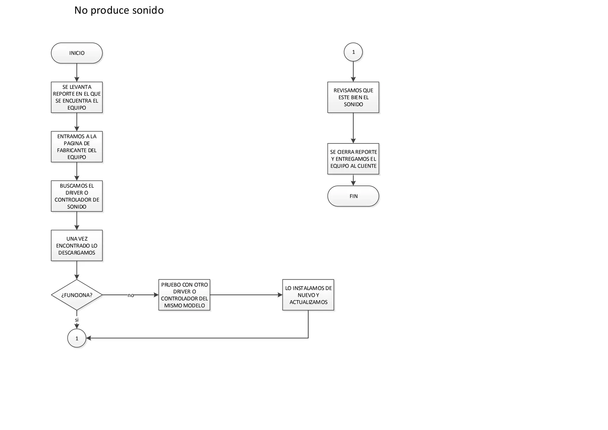 El documento describe los pasos para resolver un problema de falta de sonido en un equipo: 1) buscar el controlador de sonido en la página del fabricante, 2) descargar e instalar el controlador, 3) probar con otro controlador si no funciona el primero, y 4) revisar que el sonido esté funcionando correctamente antes de cerrar el reporte y entregar el equipo al cliente.