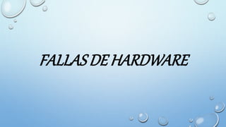 Este documento describe varias fallas comunes de hardware como un disco duro dañado, virus en la RAM, problemas con la memoria RAM, microprocesador sobrecalentado, capacitores dañados en la placa madre, sobretensión eléctrica, frecuencia incorrecta del microprocesador, tarjeta de video mal conectada, pila agotada de la BIOS y ranura dañada de la RAM. Para cada falla se explican sus síntomas, cómo identificarla y posibles soluciones.