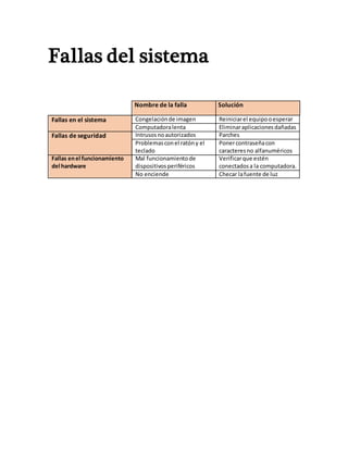 El documento lista varias fallas comunes en sistemas computacionales y sus posibles soluciones, incluyendo congelación de imágenes que se pueden resolver reiniciando el equipo, aplicaciones dañadas que causan lentitud y que se deben eliminar, y fallas de seguridad por intrusos que requieren parches de seguridad. También aborda problemas con ratones, teclados y hardware, así como fallas en el encendido.