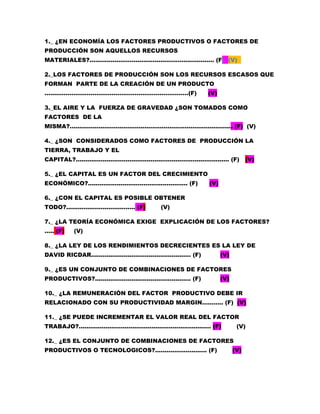 El documento trata sobre los factores productivos y factores de producción, así como conceptos económicos como el PIB, la inversión, la estructura productiva y la reforma fiscal. Explica que los factores de producción son recursos escasos como la tierra, el trabajo y el capital que se utilizan para crear un producto. También define el PIB nominal y real, y cómo se compone el PIB de un país en diferentes sectores como el primario, secundario y terciario. Finalmente, discute la importancia de la reforma fiscal para la distribución del ing