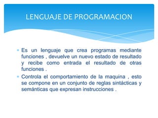 Este documento describe los lenguajes de programación. Explica que los lenguajes de programación controlan el comportamiento de la máquina mediante instrucciones y que se dividen en lenguajes interpretados y compilados. También identifica algunos lenguajes de programación populares como C, Java, y sus principales usos.