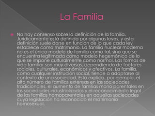 El documento discute la definición de familia y cómo ha evolucionado a través del tiempo y entre culturas. No existe una definición universal de familia, y su estructura depende de factores sociales, culturales y legales. Aunque tradicionalmente se consideraba que la familia nuclear era el único modelo, en realidad existen muchas formas diversas de familias.