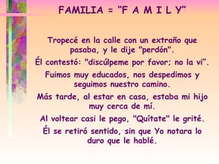 La historia trata sobre un hombre que trata cortésmente a un extraño en la calle pero luego le grita bruscamente a su hijo en casa sin darse cuenta. Más tarde, Dios le recuerda su comportamiento y le dice que vaya a la cocina donde encuentra unas flores que su hijo le cortó para darle una sorpresa, aunque se puso triste cuando su padre le gritó. El hombre se da cuenta de su error, se disculpa con su hijo y comprende la importancia de pasar tiempo de calidad con su familia.