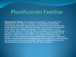 La familia es el elemento fundamental de la sociedad y merece protección. La planificación familiar permite a las parejas decidir responsablemente sobre el número de hijos y el momento de tenerlos. Existen varios métodos anticonceptivos como pastillas, condones, implantes e interrupción del coito, cada uno con diferentes niveles de efectividad para prevenir embarazos no deseados.