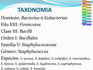 Este documento describe la taxonomía, morfología, factores de virulencia, hábitat, patologías asociadas y métodos de diagnóstico del género Staphylococcus. Pertenece al dominio de las bacterias, filo Firmicutes, son cocos Gram positivos que se agrupan en racimos y son catalasa positivos. Incluyen especies como S. aureus y S. epidermidis que son comensales de la piel y mucosas pero también patógenos oportunistas.