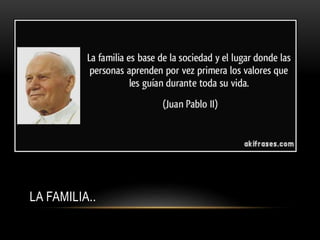 Este documento discute la importancia de la familia en la sociedad. Explica que la familia es el núcleo fundamental de donde surgen los valores morales y hábitos que forman buenos ciudadanos. También destaca que la familia es el agente más decisivo en la formación de la personalidad de una persona y su socialización inicial. Finalmente, enfatiza que la filosofía aristotélico-tomista puede guiar a la familia a comprender los problemas sociales y perfeccionarse a través de la reflexión y discusión filosófica diaria.