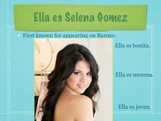 Este documento presenta breves descripciones de varias personas famosas, incluyendo Selena Gomez, Desi Arnez, Tom Cruise, Vin Diesel y Will Smith. Para cada persona, se proporciona información sobre cómo alcanzaron la fama y una o dos características físicas o de personalidad.