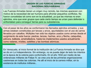 Las Fuerzas Armadas Nacionales Bolivarianas de Venezuela tienen sus orígenes en grupos que se unían para defenderse o enfrentarse por tierras para su subsistencia. Actualmente están organizadas bajo el Ministerio del Poder Popular para la Defensa y comprenden el Ejército, Armada, Aviación Militar y Guardia Nacional Bolivariana. Sus principios fundamentales incluyen la limitación imperativa y auto limitación moral, y su misión es garantizar la independencia y soberanía de la nación y la defensa del espacio geográfico.