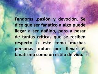 El documento habla sobre diferentes fandoms o comunidades de fans, incluyendo Star Wars, Marvel, Sherlock, Once Upon a Time, Glee, Supernatural, How I Met Your Mother, Los Simpson, Friends, Orange is the New Black y DC Comics. Brevemente describe cada uno, como Star Wars es una franquicia de ciencia ficción creada por George Lucas, Marvel publica cómics de superhéroes, Sherlock es una serie de TV sobre el detective protagonizada por Benedict Cumberbatch, y Once Upon a Time presenta personajes de cuentos de hadas en un mundo moderno.