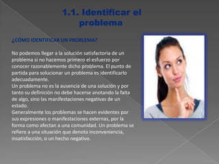 El documento explica cómo identificar y definir un problema de manera adecuada antes de poder encontrar una solución satisfactoria. Un problema se refiere a una situación que denota insatisfacción o algo negativo y se hace evidente por sus manifestaciones externas. Para resolver un problema, primero hay que entenderlo razonablemente identificando adecuadamente de qué se trata.