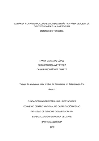 Este documento propone implementar la danza y la pintura como estrategias didácticas para mejorar la convivencia en el aula de tercer grado. Actualmente, los estudiantes presentan problemas de indisciplina e interrupciones que afectan las clases. La propuesta busca que a través de la expresión artística, los niños puedan expresar emociones y mejorar la convivencia de forma lúdica. El documento justifica la necesidad de esta estrategia y revisa el marco teórico y legal para el desarrollo de la propuesta a
