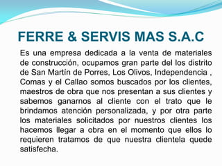 Este documento presenta un plan de comunicación de 7 etapas para la página de Facebook de la empresa Ferre & Servis Mas S.A.C. con el objetivo de dar a conocer su nuevo servicio de asesoría para la construcción. El plan describe las etapas de público objetivo, objetivos, diseño de mensaje, mix de comunicación, plan de medios, medición de resultados y administración del proceso.