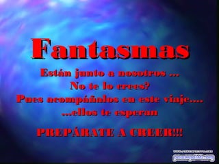Este documento presenta varias fotografías que supuestamente capturan fantasmas o entidades. Incluye imágenes de una cara fantasmal en un grupo de personas, una niña fantasmal en una foto de un incendio y varias fotos de niños con lo que parecen ser entidades invisibles a su lado. El objetivo es convencer al lector de que los fantasmas existen y pueden ser capturados en fotografías.