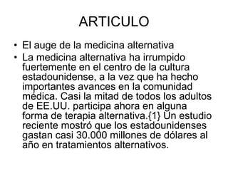 El documento discute el auge reciente de la medicina alternativa en los Estados Unidos. Casi la mitad de los adultos estadounidenses ahora participan en alguna forma de terapia alternativa y gastan casi $30 mil millones al año. Sin embargo, la medicina alternativa sigue siendo controvertida, y los cristianos deben evaluar cuidadosamente tales prácticas para asegurarse de que no promuevan enseñanzas falsas y tengan evidencia médica de su eficacia.