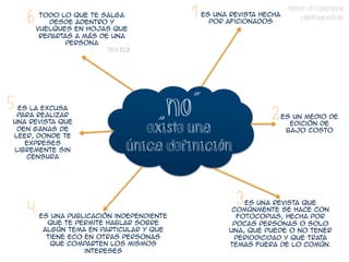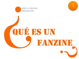 El documento describe lo que es un fanzine y sus orígenes. Un fanzine es una publicación independiente de bajo costo hecha por aficionados para compartir información sobre un tema de interés. Surgen en la década de 1940 como revistas de ciencia ficción hechas a mano por fans en Estados Unidos, y luego se expanden a música y otros temas contraculturales en los años 1960 y 1970.