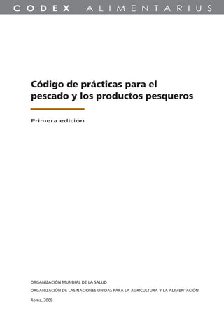 Este documento presenta el Código de Prácticas para el Pescado y los Productos Pesqueros de la Comisión del Codex Alimentarius. El Código proporciona orientación sobre las buenas prácticas durante la manipulación, producción, almacenamiento, distribución y venta de pescado y productos pesqueros para obtener productos seguros e inocuos. El Código también ayuda a cumplir con las normas del Codex. La Comisión del Codex Alimentarius es un órgano intergubernamental creado por la