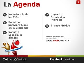 El documento describe la economía del software libre en México. Explica que el software libre tiene un impacto económico directo e indirecto significativo a nivel mundial y en México. También analiza la cuota de mercado del software libre en diferentes regiones y sectores, así como los esfuerzos en México para promover el software libre a través de la legislación y la Agenda Digital Nacional.