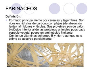 El documento describe diferentes tipos de farináceos como arroces, pastas y sus preparaciones. Explica que los arroces se cocinan a fuego lento en agua o caldo durante 20-30 minutos hasta que absorban todo el líquido. La paella valenciana tradicional lleva pollo, conejo y verduras. Los risottos italianos se hacen cociendo el arroz en caldo añadido gradualmente. Existen diversos tipos de pasta como espaguetis, macarrones, ravioles y lasañas que pueden ser fresc