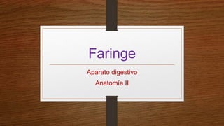 El documento detalla la anatomía de la faringe como parte del aparato digestivo, describiendo sus secciones y relaciones con estructuras cercanas en la cabeza y cuello. Se menciona la conformación de la mucosa, así como los componentes musculares y nerviosos que la inervan. Asimismo, se destacan los vasos sanguíneos y la configuración interna de la faringe, incluyendo sus principales anexos y funciones.