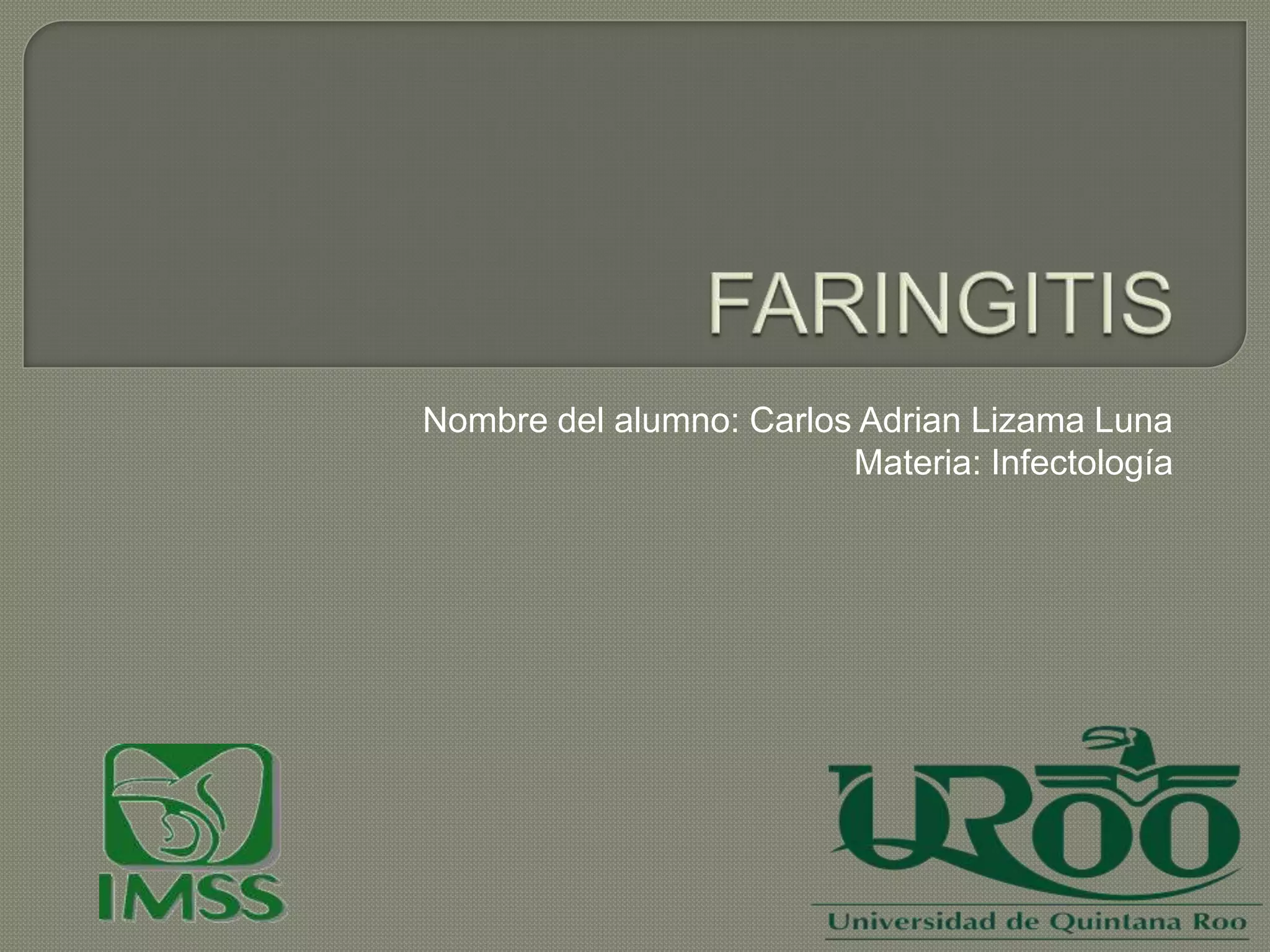El documento trata sobre la faringitis, sus causas, síntomas, diagnóstico y tratamiento. La mayoría de los casos son de etiología vírica. La faringitis bacteriana más común es causada por el estreptococo del grupo A, que puede causar complicaciones como glomerulonefritis aguda o fiebre reumática. El diagnóstico se realiza con pruebas rápidas o cultivo faríngeo. El tratamiento para estreptococo del grupo A incluye penicilina u otros antibióticos por 10 días.