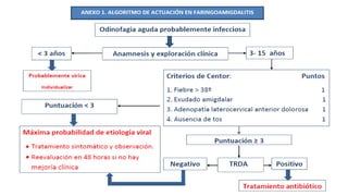 Este documento describe un estudio sobre el uso de pruebas rápidas para detectar estreptococos en casos de faringoamigdalitis pediátrica. El estudio encontró que la introducción de estas pruebas permitió evitar tratamientos antibióticos innecesarios en 2/3 de los pacientes, reduciendo el consumo de antibióticos en un 12% y ahorrando 11,320 euros. El uso de pruebas rápidas fue eficiente para optimizar el uso de antibióticos en faringoamigdalitis pediátricas.