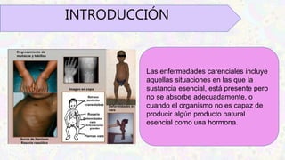 El documento trata sobre las enfermedades carenciales, incluyendo el escorbuto por déficit de vitamina C, el beri-beri por déficit de vitamina B1, y la pelagra por déficit de vitamina B3. Describe las causas, síntomas y métodos de prevención de estas enfermedades, así como los mecanismos de acción de las vitaminas involucradas. También menciona otros déficits como el de ácido fólico, vitamina B2 y vitamina D.