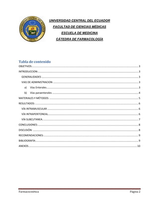 El documento detalla un experimento sobre la farmacocinética del pentobarbital sódico administrado a ratones a través de diferentes vías (intramuscular, intraperitoneal y subcutánea), analizando sus efectos y tiempos de respuesta. Se evidenció que la vía intramuscular presentó la acción más rápida, seguida por la intraperitoneal y finalmente la subcutánea que resultó ser la más lenta. Se enfatiza la importancia de manejar a los animales de experimentación con responsabilidad y cuidado.