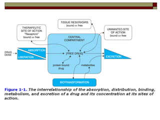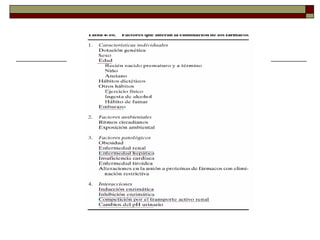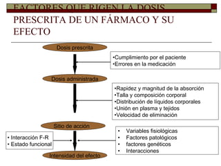 El documento describe factores que afectan la dosificación y efecto de un fármaco. Explica que la dosis prescrita depende del cumplimiento del paciente y posibles errores, mientras que la dosis administrada depende de la absorción, distribución corporal y eliminación. El efecto del fármaco depende de su llegada al sitio de acción y está influenciado por factores fisiológicos, patológicos y genéticos, así como por interacciones.
