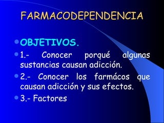 El documento trata sobre la farmacodependencia. Explica que ciertas sustancias causan adicción al alterar los neurotransmisores en el cerebro y producir placer. Describe los diferentes tipos de fármacos que pueden causar adicción como estimulantes, depresores, narcóticos y más. También analiza los factores individuales, familiares y sociales que pueden contribuir al desarrollo de la farmacodependencia y los cuatro estados por los que pasan los usuarios: habituación, adicción, tolerancia y síndrome de