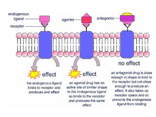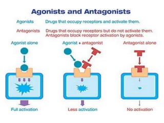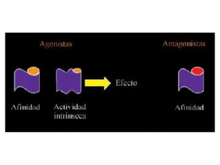 El documento describe los conceptos fundamentales de farmacodinamia, incluyendo la interacción de los fármacos con los receptores, los tipos de agonistas y antagonistas, y la tolerancia a los fármacos. Además, clasifica los principales receptores fisiológicos y proporciona ejemplos de fármacos para cada familia.