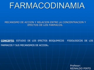 El documento aborda la farmacodinamia, centrándose en los mecanismos de acción de los fármacos y su interacción con mecanismos bioquímicos y fisiológicos en el organismo. Se discuten conceptos clave como receptores de fármacos, tipos de acciones farmacológicas, factores que modifican su efecto, y la formación de segundos mensajeros. Además, se analizan diferentes tipos de receptores y la influencia de variables como dosis, peso, edad y sexo en la acción farmacológica.