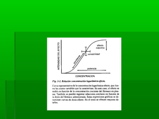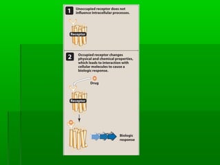 Este documento describe conceptos fundamentales de farmacodinamia como la definición, tipos de receptores, mecanismos de acción de fármacos como agonistas y antagonistas, y la relación entre la estructura química de los fármacos y su actividad. Explica cómo los fármacos interactúan con los receptores de manera reversible o irreversible y cómo esto afecta su efecto farmacológico.
