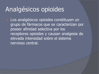 El documento habla sobre los analgésicos opioides. Explica que estos fármacos actúan uniéndose a receptores opioides en el sistema nervioso central, causando una potente analgesia. También describe el sistema opioide endógeno, los diferentes tipos de receptores opioides, y los mecanismos de acción, efectos y clasificaciones de los analgésicos opioides. Finalmente, detalla aspectos como la farmacocinética, farmacodinamia, efectos adversos y tolerancia a estos fármacos.