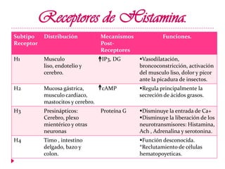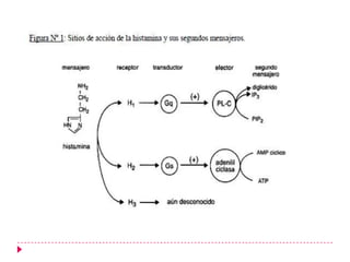 Este documento presenta información sobre diferentes medicamentos utilizados para tratar la rinitis alérgica, rinitis vasomotora, urticaria y edema vasogénico. Explica los receptores de histamina, antihistamínicos de primera, segunda y tercera generación como la clorfenamina, loratadina y fexofenadina, así como esteroides y sus efectos.