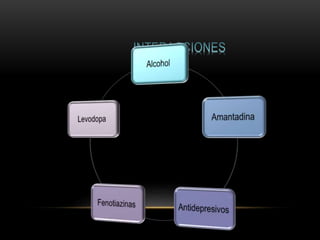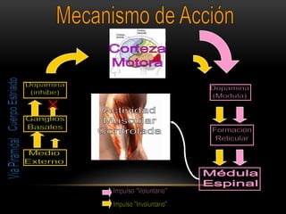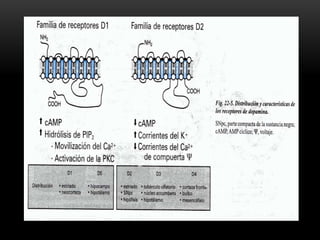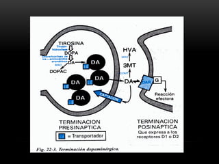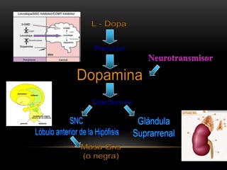 Las catecolaminas son sustancias naturales que actúan como neurotransmisores. Se sintetizan a partir del aminoácido tirosina y son secretadas por el sistema nervioso simpático y la médula suprarrenal. Incluyen la dopamina, noradrenalina y adrenalina, y regulan funciones fisiológicas para preservar la homeostasis. Se unen a receptores en la neurona postsináptica para ejercer sus efectos estimulantes en el SNC, aunque no cruzan fácilmente la barrera hematoencefá