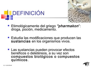 La farmacología estudia los efectos de los fármacos en los organismos vivos y se divide en varias áreas como la farmacocinética, farmacodinamia y farmacoterapia. La enfermera desempeña un papel importante en el uso racional de los medicamentos asegurando su administración, almacenamiento y monitoreo según las indicaciones.