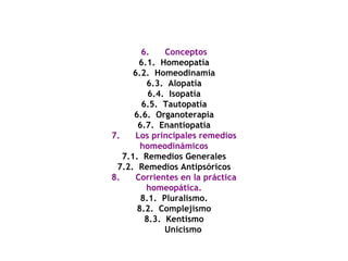 El documento presenta una guía detallada sobre los principios y procesos de la homeopatía, incluyendo definiciones de términos clave, las escalas y métodos de dilución, y procedimientos específicos para preparar remedios a partir de sustancias vegetales, animales y minerales. Se explican conceptos como la farmacopea homeopática, los remedios homeodinámicos, y distintas corrientes dentro de la práctica homeopática. Además, se describen los materiales y pasos requeridos para lle