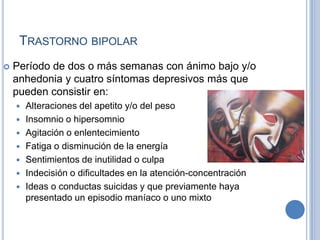 Este documento describe los principales fármacos utilizados en el tratamiento del trastorno bipolar, incluyendo litio, valproato de sodio, carbamazepina y lamotrigina. Explica sus mecanismos de acción, administración, presentaciones y efectos adversos comunes. También resume brevemente la epidemiología del trastorno bipolar y el papel de estos medicamentos en la profilaxis de episodios maníacos.