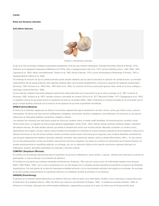 El documento proporciona información sobre varias plantas y medicamentos naturales, incluyendo sus usos terapéuticos reportados y posibles efectos adversos. Describe propiedades de plantas como el ajo, el árnica, el comfrey, el ginseng, el ginkgo biloba, la hierba de San Juan, el noni, la valeriana y la penca sávila. También menciona brevemente fármacos artificiales como la aspirina y el ibuprofeno, así como la ingeniería genética.