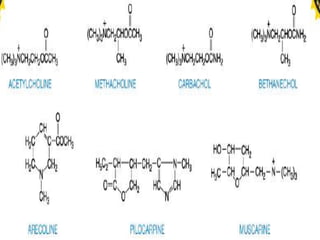 Este documento describe la síntesis, receptores y efectos de los fármacos colinérgicos. La acetilcolina se sintetiza en el hígado a partir de colina y acetil coenzima A. Actúa en receptores nicotínicos y muscarínicos. Los agonistas muscarínicos como la acetilcolina aumentan las secreciones y la motilidad gastrointestinal mientras que los antagonistas muscarínicos como la atropina causan efectos opuestos como la disminución de las secreciones y la motilidad.