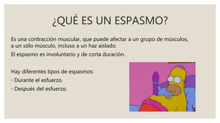 El documento describe los espasmos musculares y los medicamentos espasmolíticos utilizados para aliviarlos, incluyendo sus mecanismos de acción y efectos secundarios. Se abordan varios fármacos como tizanidina, dantroleno, baclofeno y carisoprodol, junto con sus indicaciones terapéuticas y contraindicaciones. Además, se detallan las dosis recomendadas y precauciones necesarias para su uso seguro en pacientes.