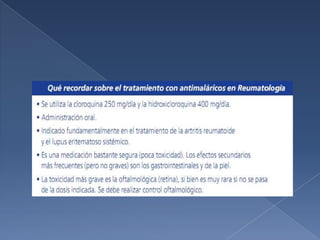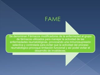 Los fármacos modificadores de la enfermedad actúan provocando una inmunosupresión selectiva para evitar la progresión de las enfermedades reumatológicas y sus limitaciones funcionales. Algunos fármacos como el metotrexato e inhibidores biológicos actúan inhibiendo la inflamación, mientras que otros como la azatioprina y ciclofosfamida provocan la muerte celular para detener el proceso inflamatorio. Estos fármacos tienen efectos a largo plazo y se requieren meses para