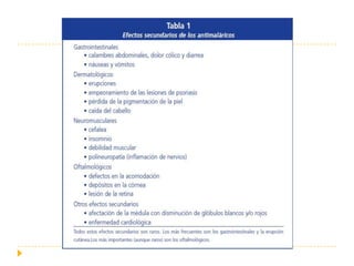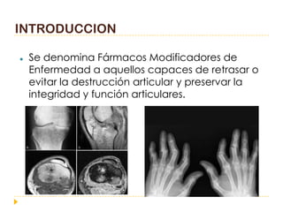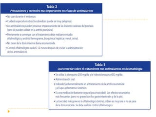 Este documento describe varios fármacos moduladores de la enfermedad utilizados para tratar la artritis reumatoide, incluidos leflunomida, oro intramuscular y oral, minociclina, hidroxicloroquina, cloroquina, azatioprina y ciclofosfamida. También discute la sulfasalacina, su mecanismo de acción, posología e interacciones. El objetivo principal del tratamiento de la artritis reumatoide es suprimir la actividad de la enfermedad de manera preco