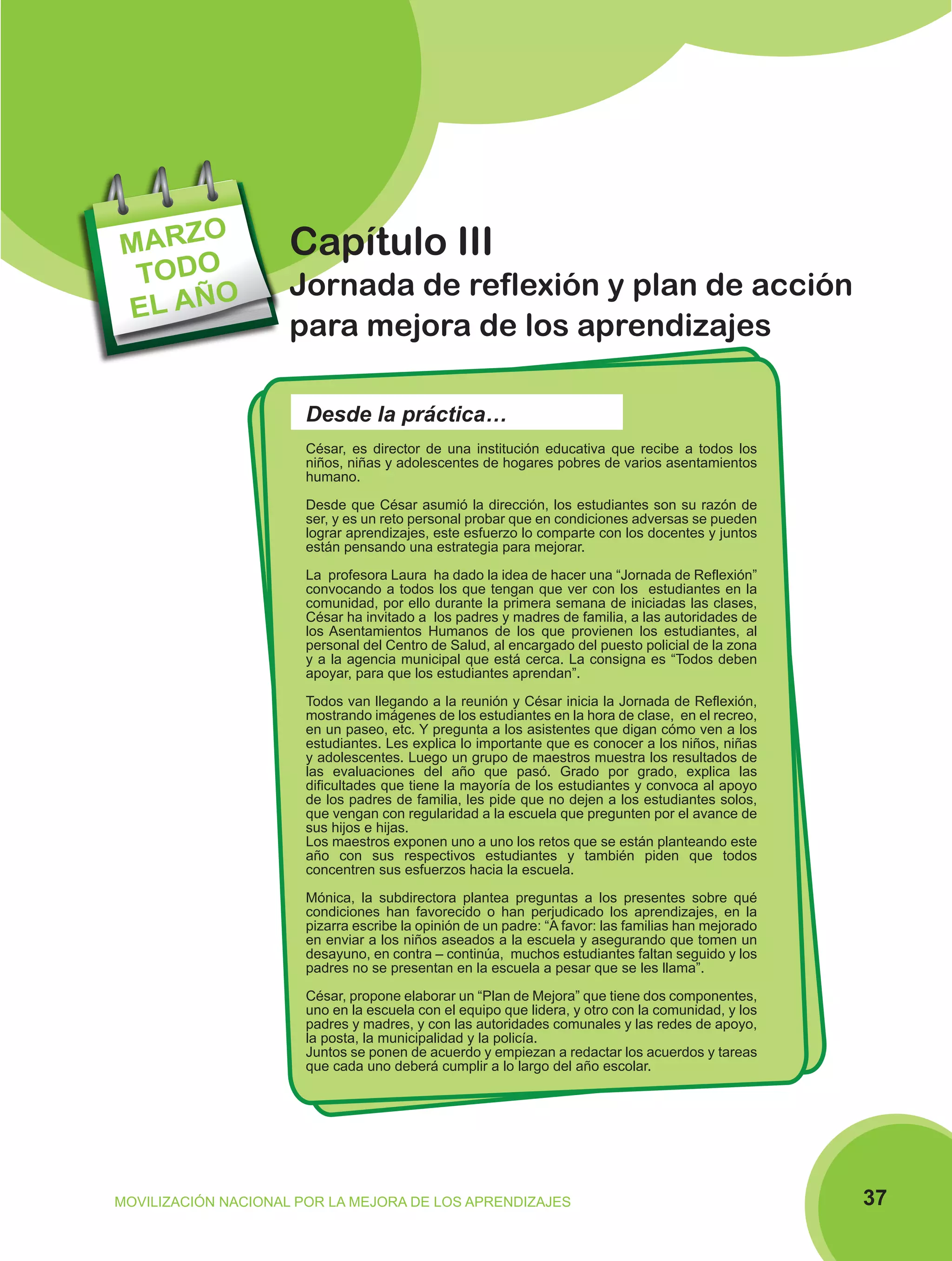 La Jornada de Reflexión se enfoca en analizar los factores que influyen en los aprendizajes de los estudiantes, definir metas de aprendizaje por aula, e identificar estrategias para que ningún estudiante se quede atrás. Los directivos, docentes, padres y la comunidad trabajan juntos para elaborar un Plan de Mejora que establezca compromisos para lograr las metas de aprendizaje planteadas a lo largo del año escolar.